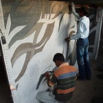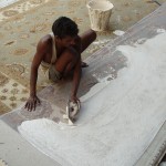 The tufting process is much faster than knotting. This makes it much cheaper, however it is not possible to achieve the same detail in design. In addition a tufted rug will not be anywhere near as hard wearing as a knotted rug. The first stage is the preparation of the canvas. For this the design is inked onto the canvas using a stencil. The wool tufts are then pushed through the canvas using a tufting gun. Latex is then spread over the back, in order to hold the tufts in place, this is finally covered over with a cotton backing.